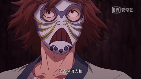 古海的脸谱形态最帅时刻,当然是大破天刀阵生死棋局。开玩笑,这么重要的时刻怎么可以不戴脸谱。我发现这部动画里古海的脸谱基本是白色打底。