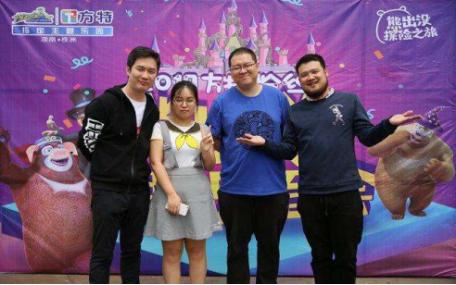 先来说说光头强的配音:谭笑吧(我们说的仅仅是《熊出没》中第一部配音演员),谭笑这个名字有百度百科,不过实际上那位谭笑是童星谭笑,而光头强的配音是个成年的谭笑。上图最右边的就是谭笑了,实际上是个还挺清秀的人(好奇的可以去看看《天天向上》《熊出没》配音演员来的那期),不知何时就蓄起了大胡子……